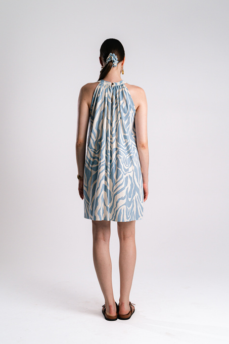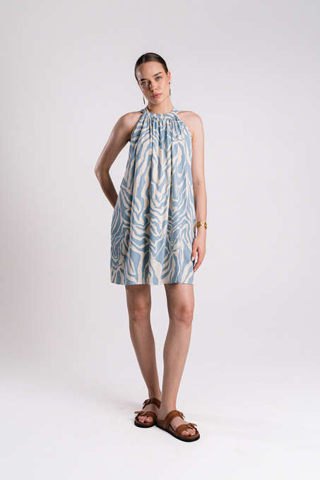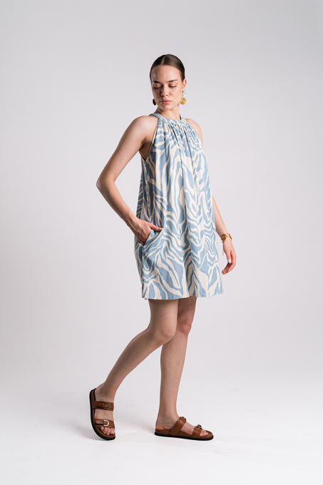 • Naturalna i stylowa – z lnu i wiskozy, w błękitnym princie inspirowanym naturą. Pasek w talii pozwala regulować fason, a przewiewna tkanina sprawia, że to idealna sukienka na lato. Polski projekt i produkcja.